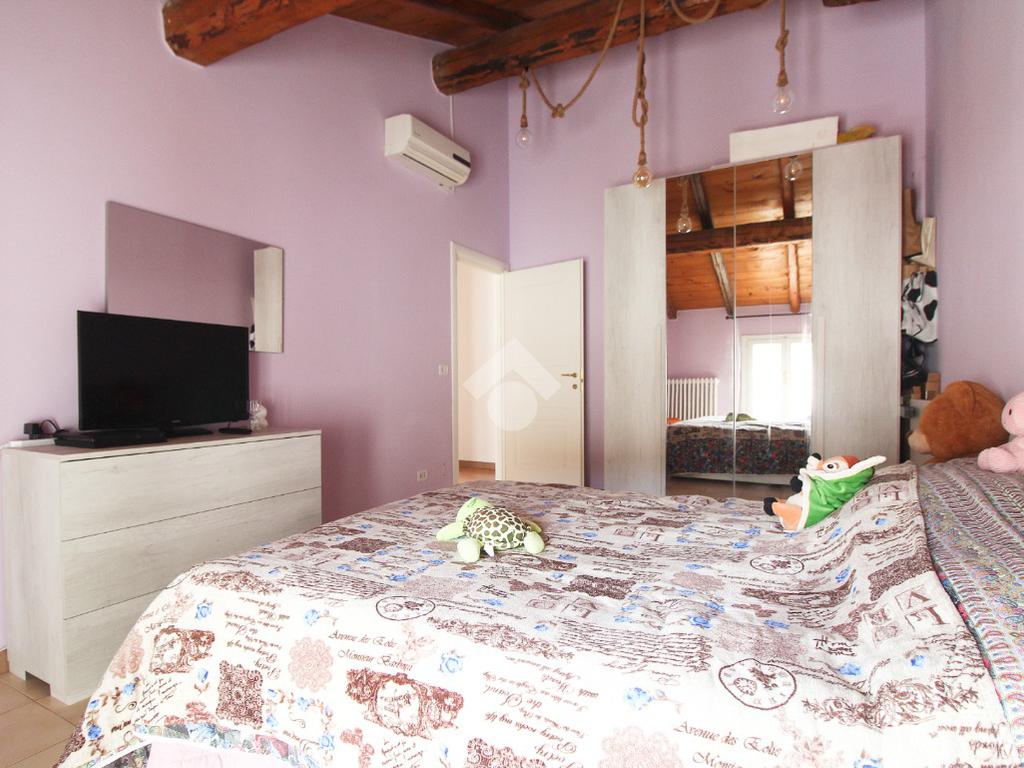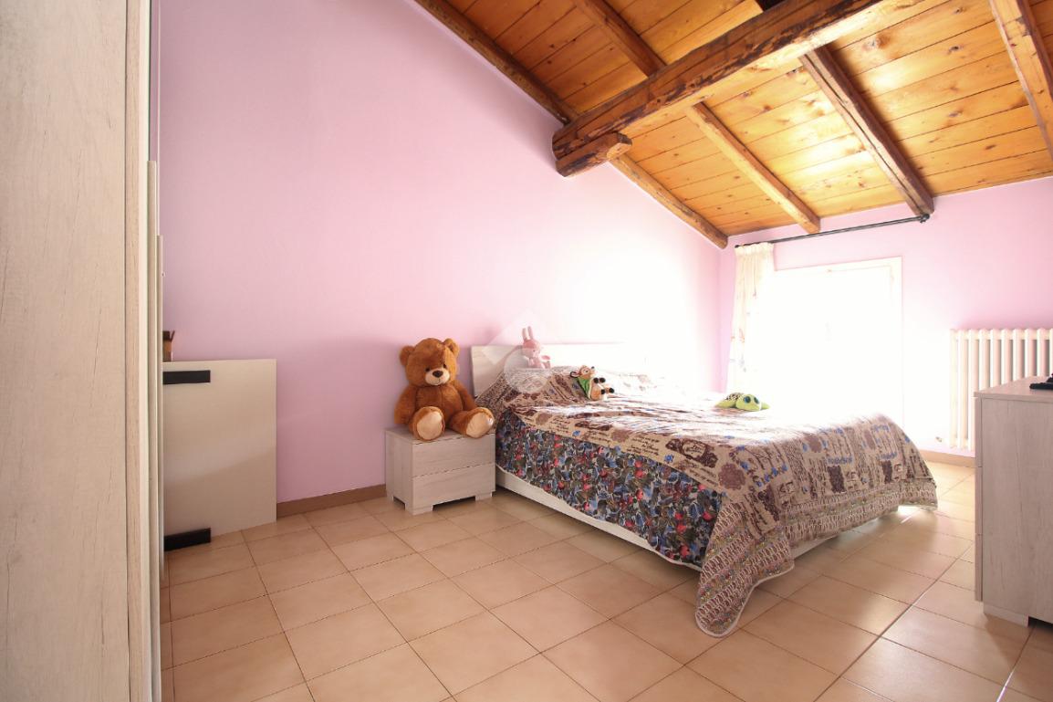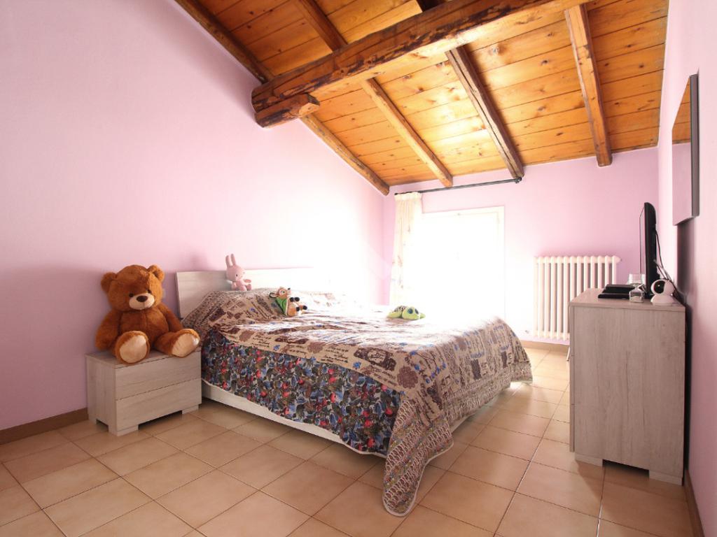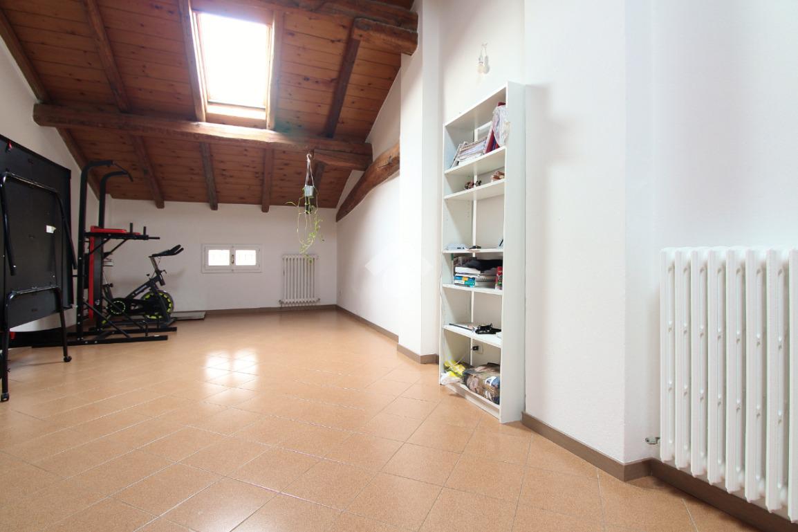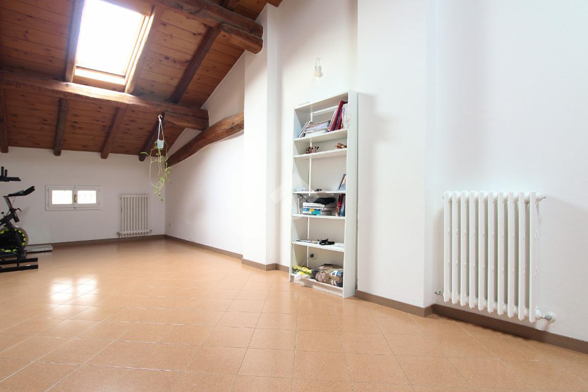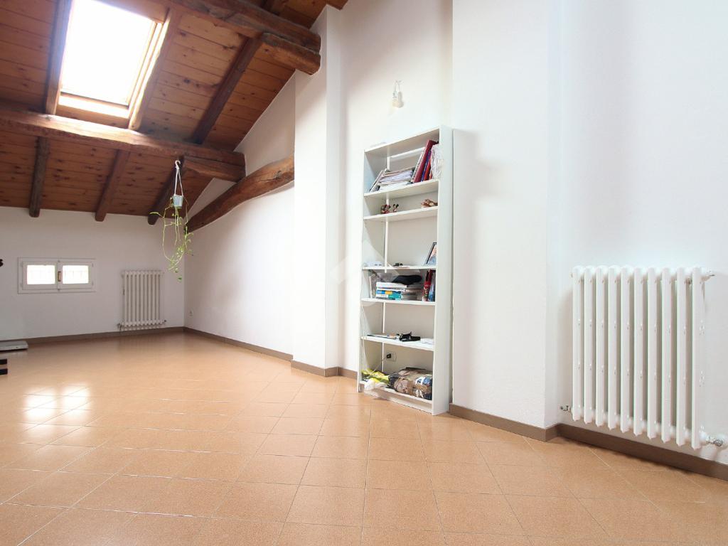 L'immobile è un appartamento che occupa gli ultimi due piani di una palazzina ubicata a San Pietro in Casale, nel cuore del paese. L'ingresso dell'abitazione, dalla pianta regolare e non angusto, permette di ospitare comodi armadi contenitori. La zona giorno è suddivisa in due ambienti: la cucina abitabile ed un ampio soggiorno con caratteristico affaccio sulla piazza del paese. Il piano si completa di camera, dalle dimensioni matrimoniali, e bagno servito da terrazzo. Il secondo ed ultimo livello, con travi in legno a vista, ospita la zona notte con altre due camere da letto e un ampio ambiente pluriuso. Sono presenti il secondo bagno ed un ripostiglio. La proprietà si completa, al piano terra, di cantina.