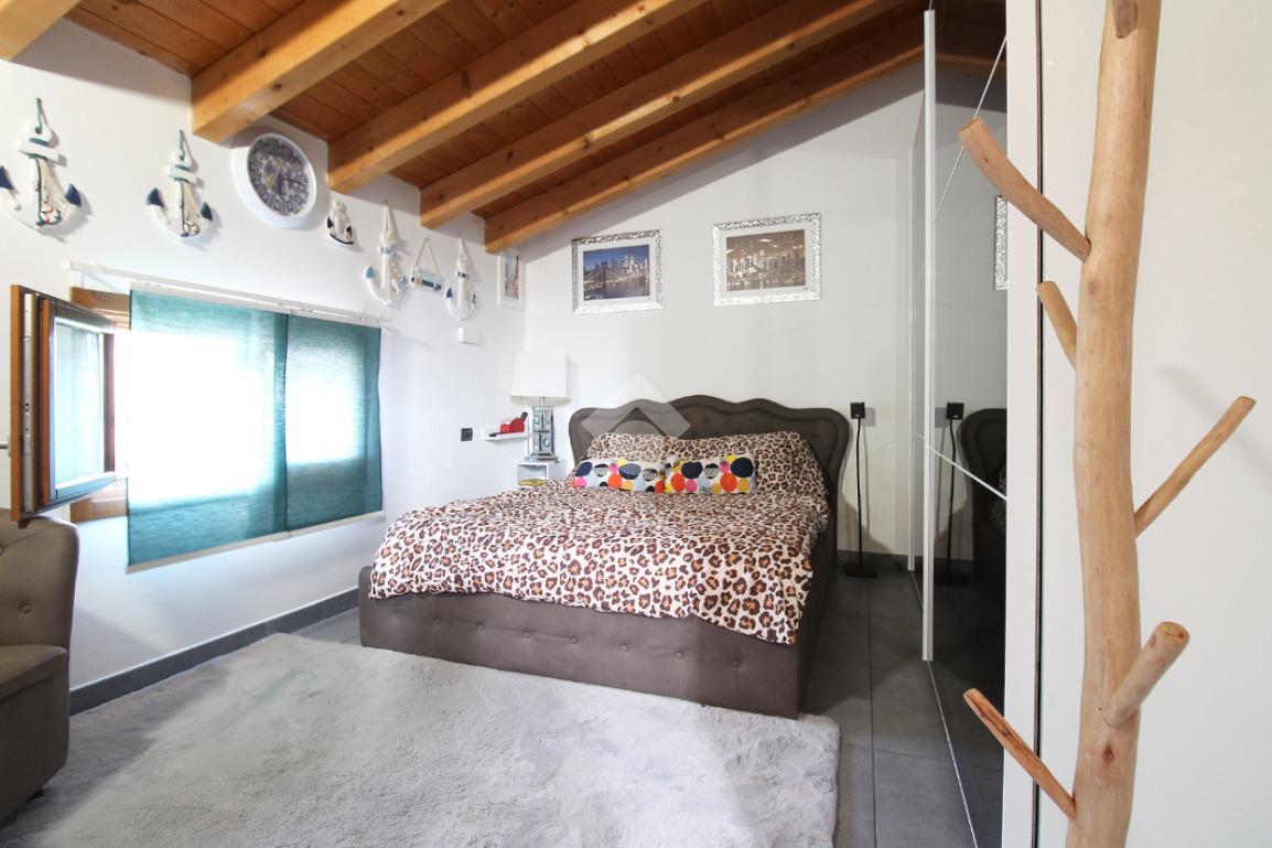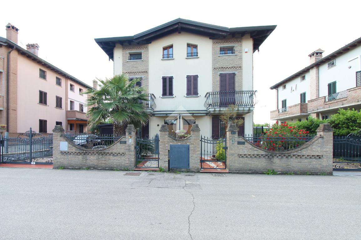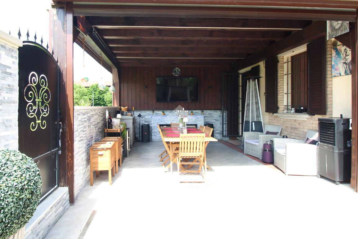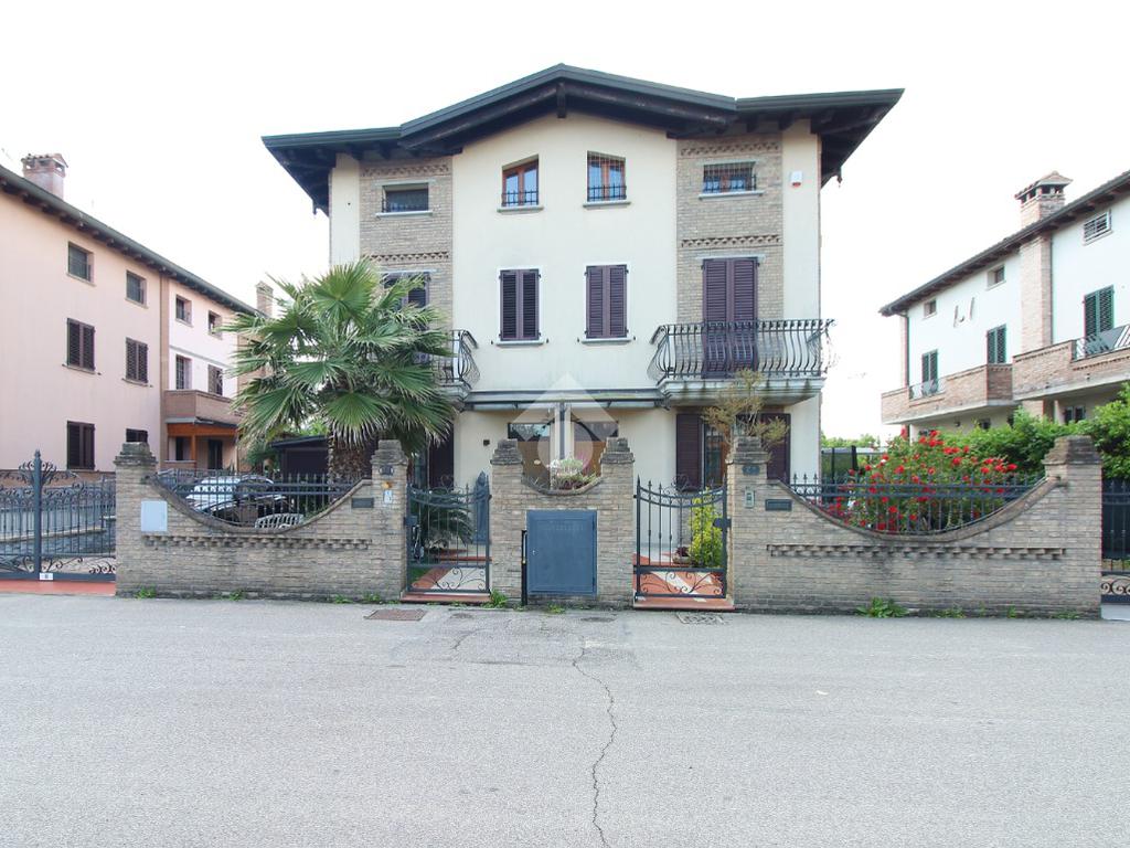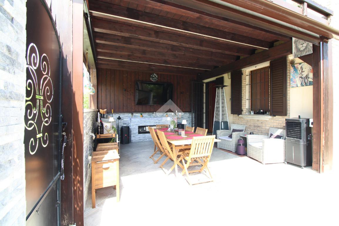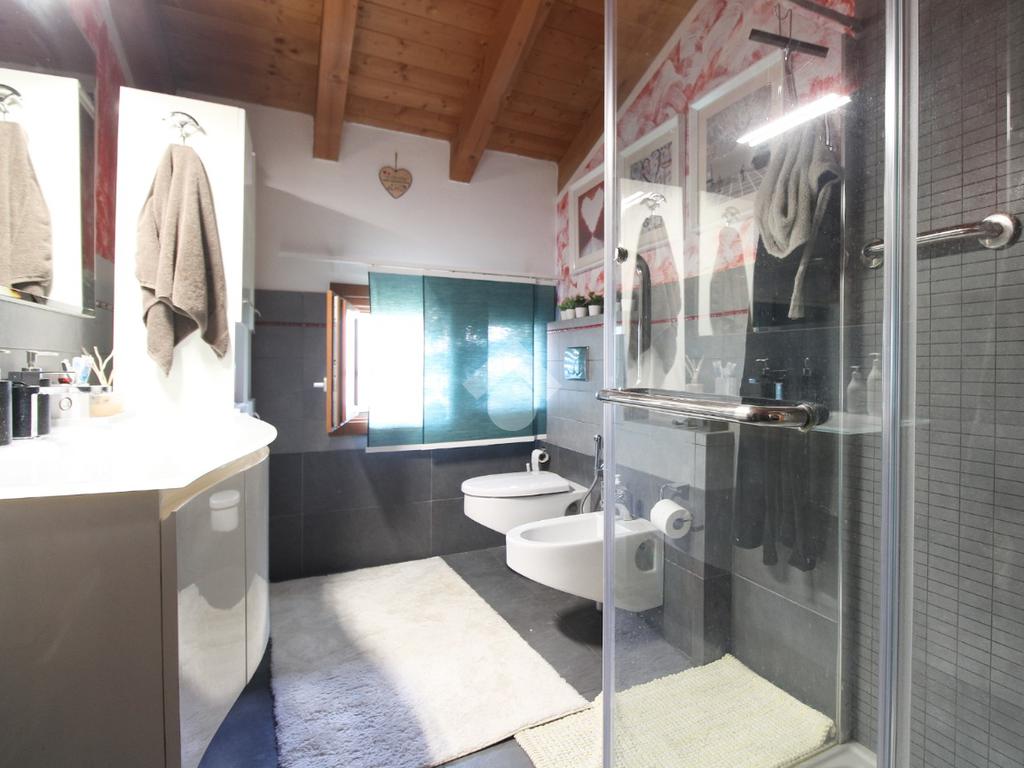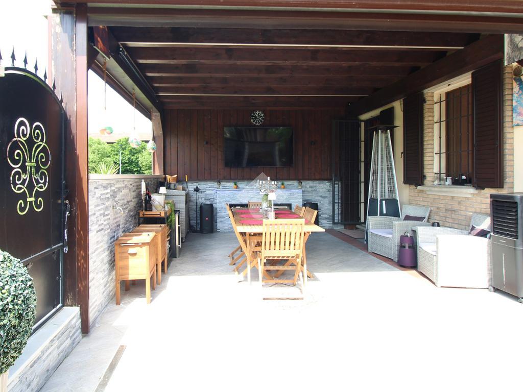 L'immobile è una porzione di bifamiliare circondata su tre lati da corte privata di circa 200 mq. Costruita nel 2007, ha subìto un ulteriore restyling nel 2017, con l'aggiunta di un impianto fotovoltaico di 27 kwh e due batterie d'accumulo. Sorge nel paese di San Pietro in Casale, in una zona esclusivamente residenziale riparata dal traffico. Internamente l'abitazione è organizzata su tre livelli, tutti serviti da bagno. La porta d'ingresso si apre su un ampio soggiorno caratterizzato da camino; la cucina è abitabile e occupa un ambiente indipendente. Il piano terra si completa di bagno e zona lavanderia che accede, sul retro, ad una comoda veranda protetta da teli motorizzati. Il piano superiore è dedicato agli ambienti notte distribuiti da un disimpegno che diventa molto più di una zona di passaggio poiché arredato e illuminato da vetrate che sfruttano tutta la sua altezza. Il piano è caratterizzato da tre camere da letto: la camera padronale servita da bagno e cabina armadio, una seconda camera matrimoniale ed una cameretta con affaccio su balcone. Anche la zona notte ha i servizi igienici. Infine, il piano mansarda di circa 80 mq, interamente rifinito e caratterizzato da una zona giorno con angolo cottura, due camere, un bagno ed un ripostiglio. La casa è dotata di riscaldamento a pavimento, impianto di aria condizionata in tutti gli ambienti, di sistema di allarme. In ottime condizioni e completa di tutto l'arredo, è pronta per essere abitata.