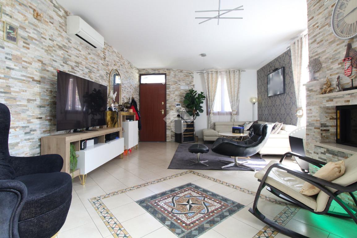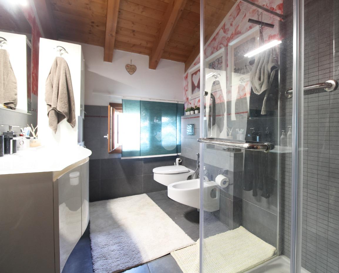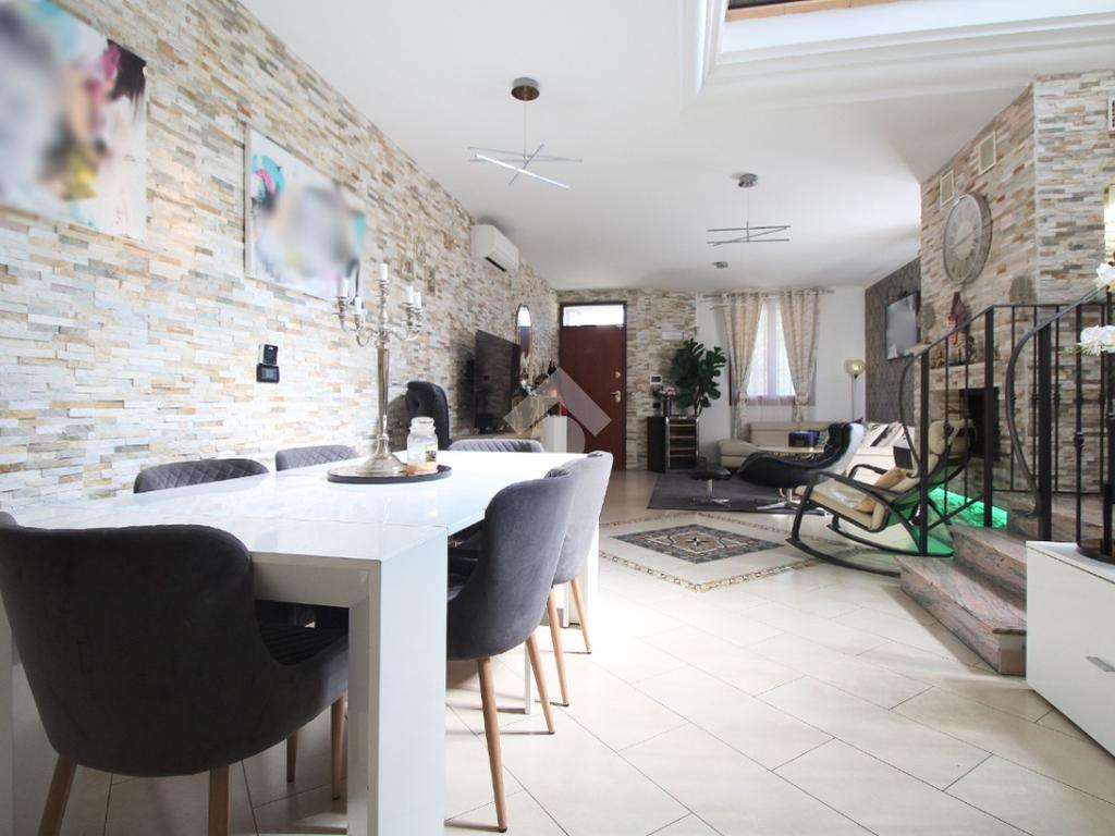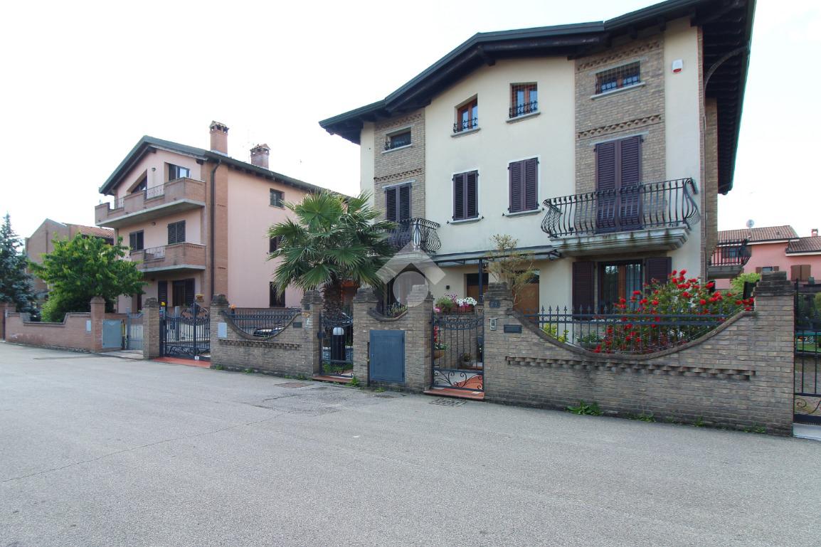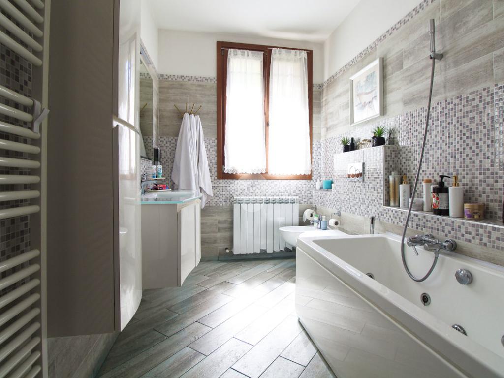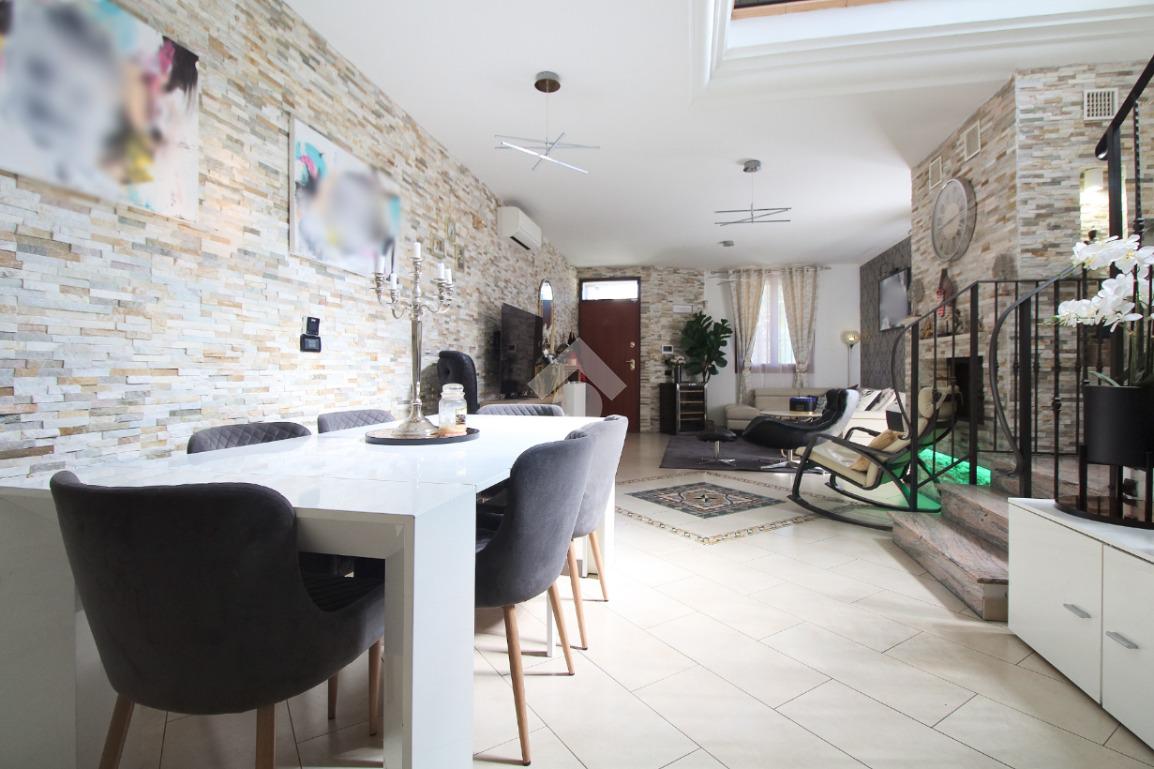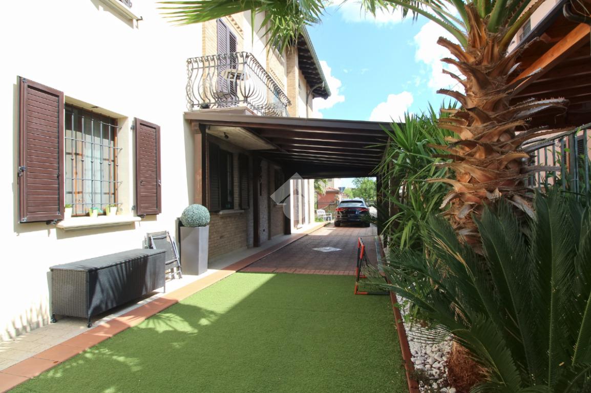 L'immobile è una porzione di bifamiliare circondata su tre lati da corte privata di circa 200 mq. Costruita nel 2007, ha subìto un ulteriore restyling nel 2017, con l'aggiunta di un impianto fotovoltaico di 27 kwh e due batterie d'accumulo. Sorge nel paese di San Pietro in Casale, in una zona esclusivamente residenziale riparata dal traffico. Internamente l'abitazione è organizzata su tre livelli, tutti serviti da bagno. La porta d'ingresso si apre su un ampio soggiorno caratterizzato da camino; la cucina è abitabile e occupa un ambiente indipendente. Il piano terra si completa di bagno e zona lavanderia che accede, sul retro, ad una comoda veranda protetta da teli motorizzati. Il piano superiore è dedicato agli ambienti notte distribuiti da un disimpegno che diventa molto più di una zona di passaggio poiché arredato e illuminato da vetrate che sfruttano tutta la sua altezza. Il piano è caratterizzato da tre camere da letto: la camera padronale servita da bagno e cabina armadio, una seconda camera matrimoniale ed una cameretta con affaccio su balcone. Anche la zona notte ha i servizi igienici. Infine, il piano mansarda di circa 80 mq, interamente rifinito e caratterizzato da una zona giorno con angolo cottura, due camere, un bagno ed un ripostiglio. La casa è dotata di riscaldamento a pavimento, impianto di aria condizionata in tutti gli ambienti, di sistema di allarme. In ottime condizioni e completa di tutto l'arredo, è pronta per essere abitata.