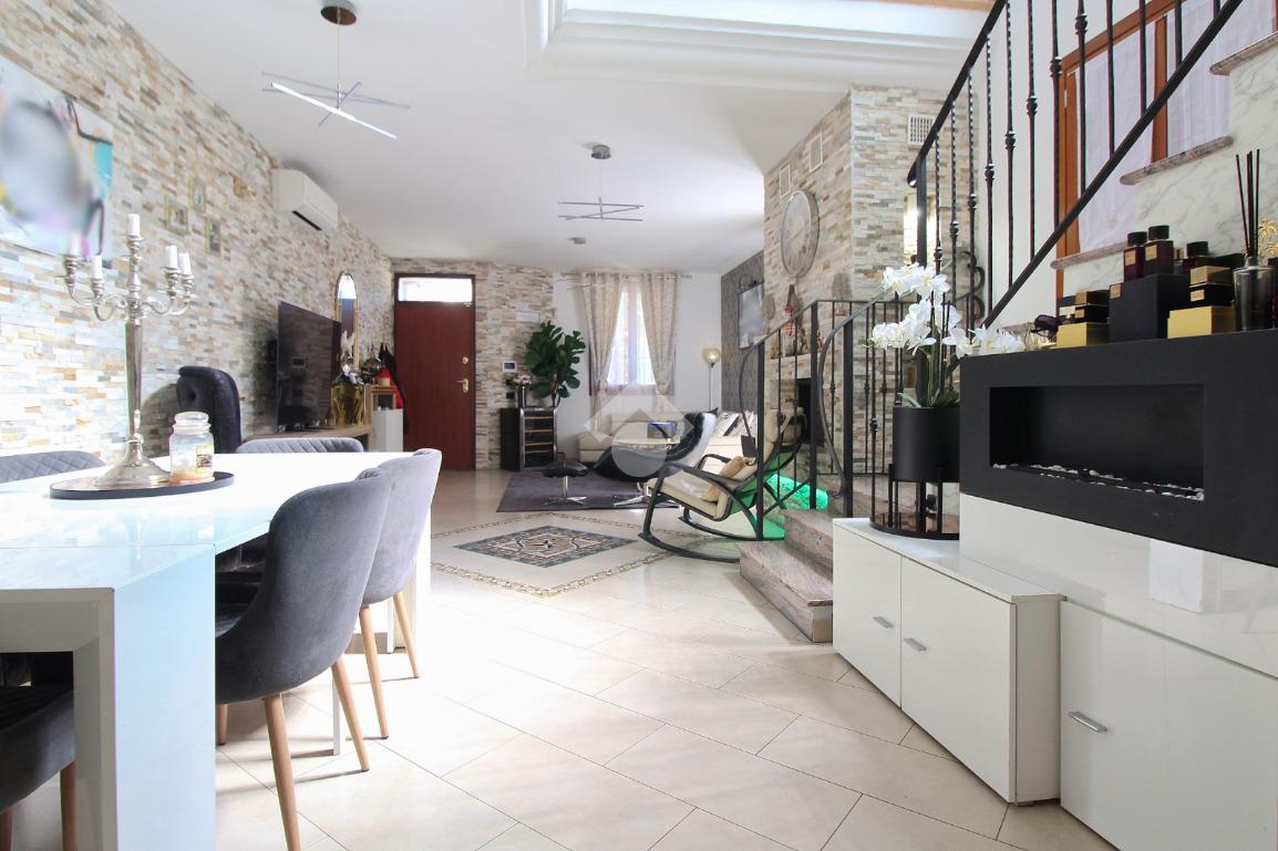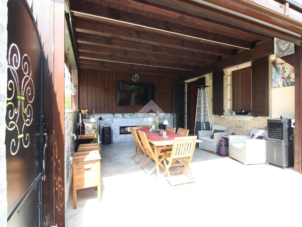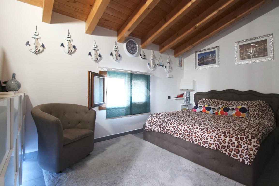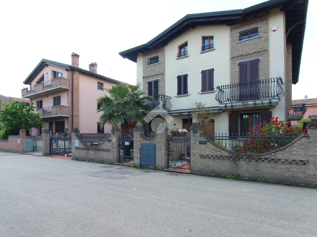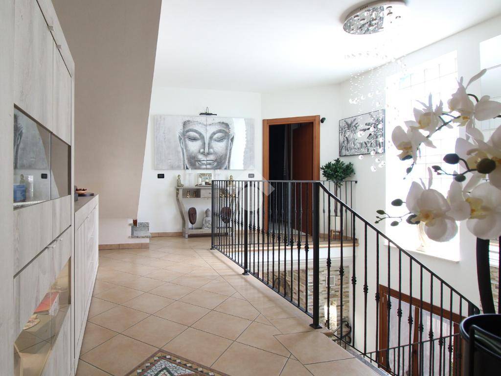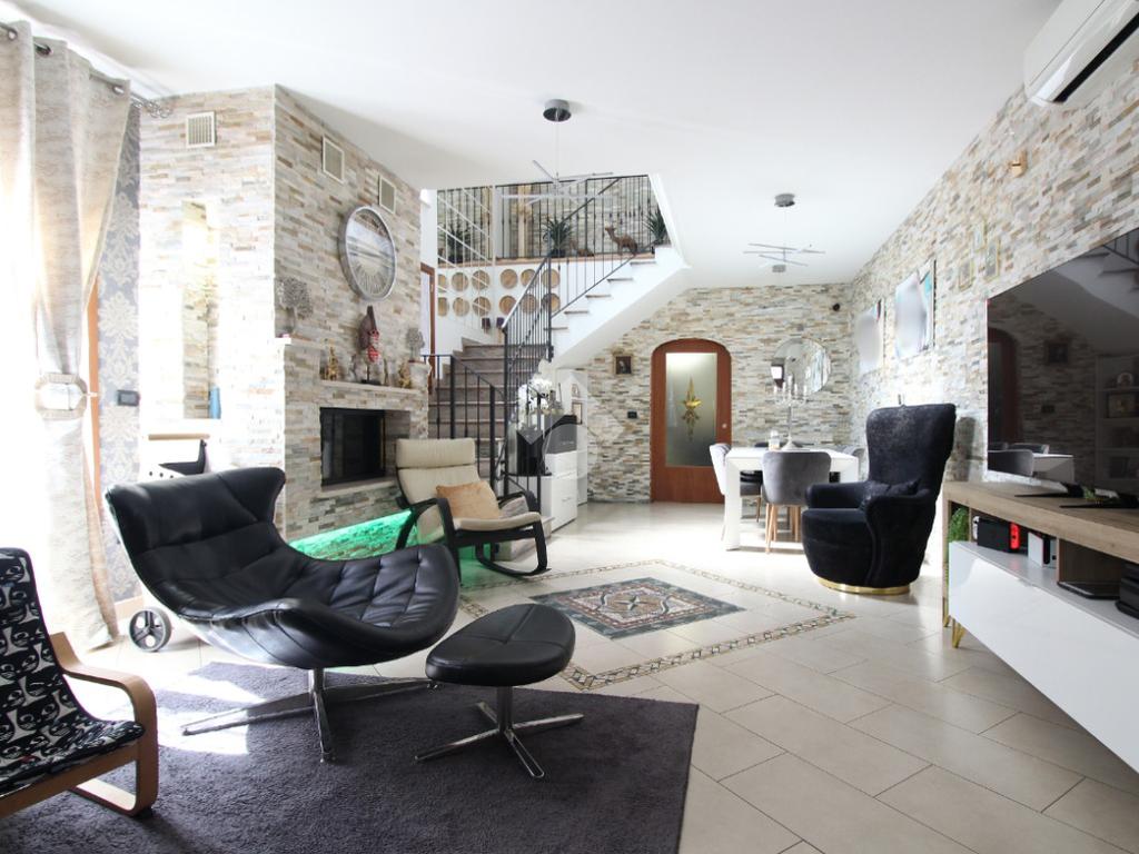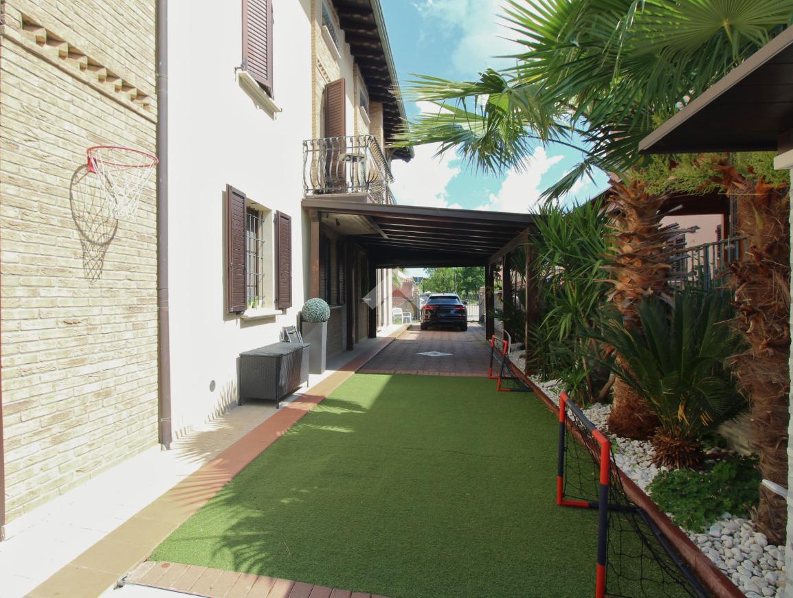 L'immobile è una porzione di bifamiliare circondata su tre lati da corte privata di circa 200 mq. Costruita nel 2007, ha subìto un ulteriore restyling nel 2017, con l'aggiunta di un impianto fotovoltaico di 27 kwh e due batterie d'accumulo. Sorge nel paese di San Pietro in Casale, in una zona esclusivamente residenziale riparata dal traffico. Internamente l'abitazione è organizzata su tre livelli, tutti serviti da bagno. La porta d'ingresso si apre su un ampio soggiorno caratterizzato da camino; la cucina è abitabile e occupa un ambiente indipendente. Il piano terra si completa di bagno e zona lavanderia che accede, sul retro, ad una comoda veranda protetta da teli motorizzati. Il piano superiore è dedicato agli ambienti notte distribuiti da un disimpegno che diventa molto più di una zona di passaggio poiché arredato e illuminato da vetrate che sfruttano tutta la sua altezza. Il piano è caratterizzato da tre camere da letto: la camera padronale servita da bagno e cabina armadio, una seconda camera matrimoniale ed una cameretta con affaccio su balcone. Anche la zona notte ha i servizi igienici. Infine, il piano mansarda di circa 80 mq, interamente rifinito e caratterizzato da una zona giorno con angolo cottura, due camere, un bagno ed un ripostiglio. La casa è dotata di riscaldamento a pavimento, impianto di aria condizionata in tutti gli ambienti, di sistema di allarme. In ottime condizioni e completa di tutto l'arredo, è pronta per essere abitata.